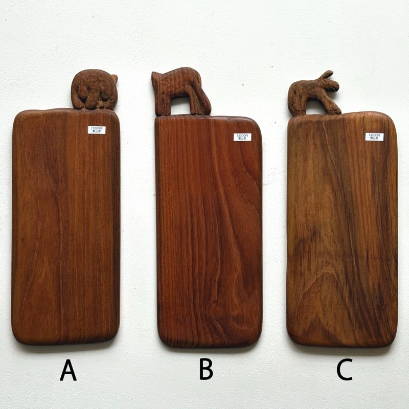 奥山泉さんの動物などユニークな彫刻が施されたカットボード。トレーとして使用するのもお勧めですです。