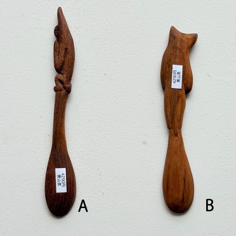 奥山泉さんの動物などのユニークな彫刻が施されたスプーン