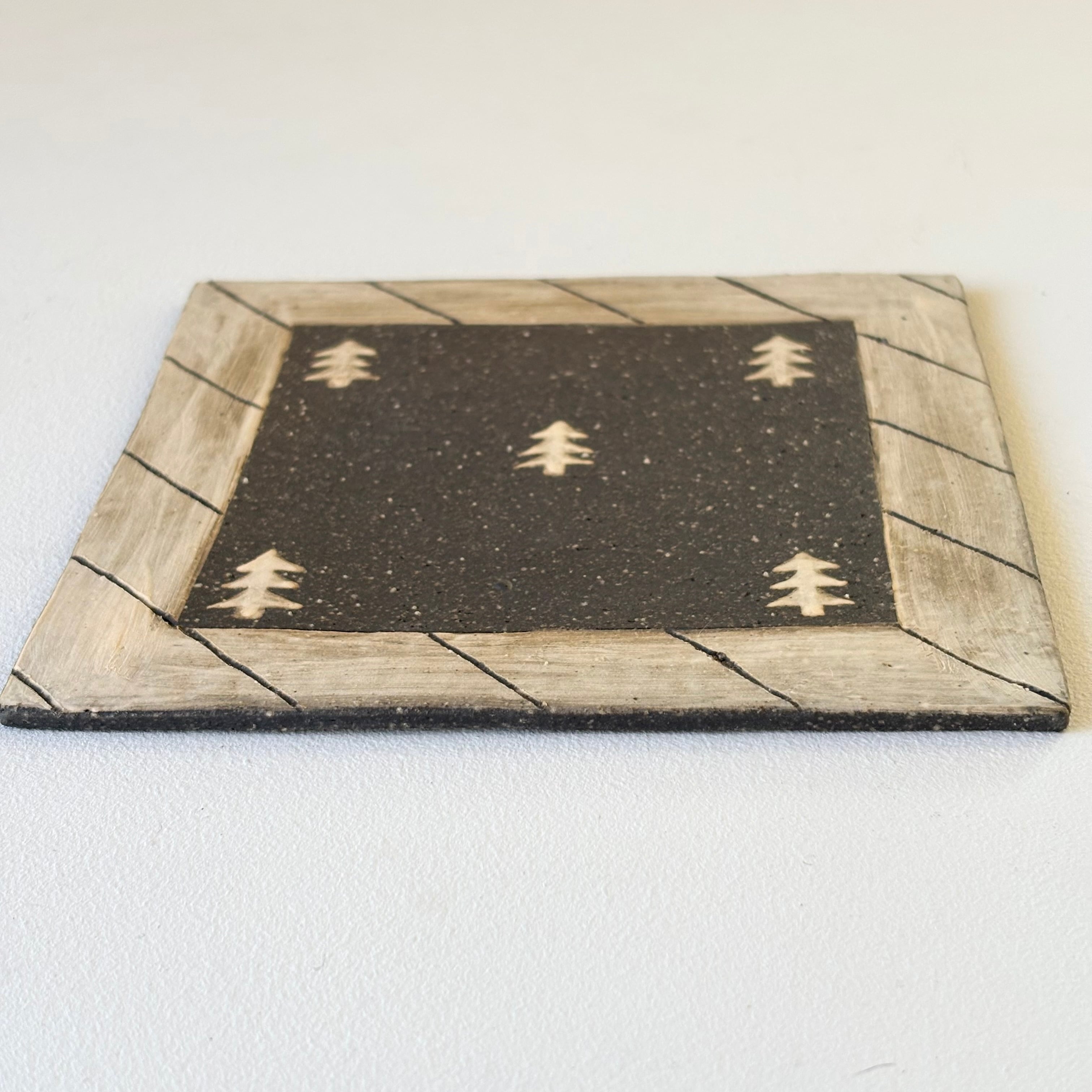 ざらりとした土の表情にモミの木絵付けが物語を感じさせます