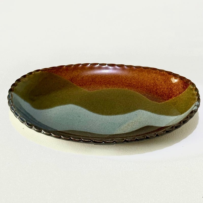 スリップウェアの掛け分けの模様と色の組み合わせに独自の世界感があって素敵です。